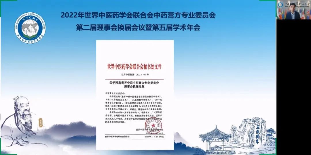 2022年12月4日上午,世界中醫(yī)藥學(xué)會(huì)聯(lián)合會(huì)(世界中聯(lián))中醫(yī)膏方專業(yè)委員會(huì)第二屆理事會(huì)換屆會(huì)議暨第五屆學(xué)術(shù)年會(huì)通過線上方式隆重召開。世界中聯(lián)主席馬建中向大會(huì)發(fā)來視頻致辭,學(xué)術(shù)部主任焦云洞代表世界中聯(lián)參加大會(huì),全國政協(xié)委員、首都名中醫(yī)、享受國務(wù)院政府特殊津貼專家、世界中聯(lián)中醫(yī)膏方專業(yè)委員會(huì)會(huì)長、北京康益德中西醫(yī)結(jié)合肺科醫(yī)院董事長兼院長董瑞和顧問、副會(huì)長、常務(wù)理事、理事及會(huì)員共335人參加了大會(huì)。其中來自匈牙利、葡萄牙、澳大利亞、俄羅斯、瑞典、波蘭、英國、美國、芬蘭、韓國、中國香港、中國澳門、中國臺(tái)灣等地的外籍專家學(xué)者65人。會(huì)議由第一屆理事會(huì)秘書長秦洪義教授主持。