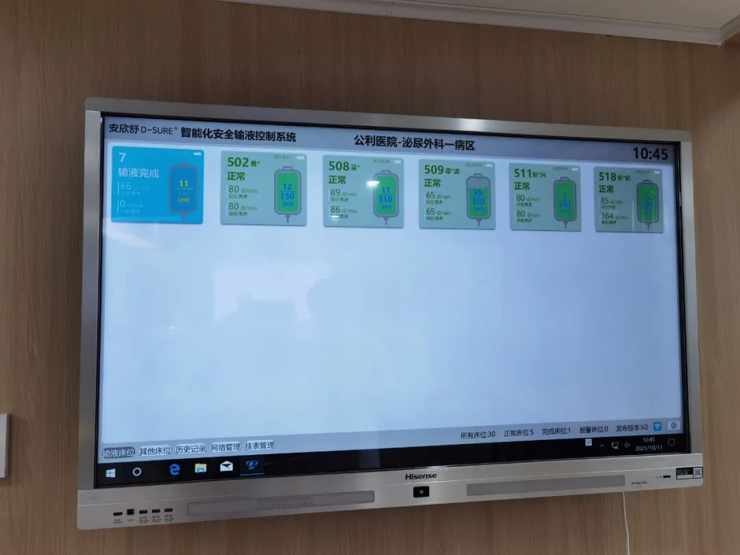 確定了用哪種輸液監(jiān)控技術(shù),變成“智慧輸液”卻還需要一個(gè)信息化工程,這就是信息護(hù)士產(chǎn)生的原因。以智慧輸液為例,要讓輸液信息“跑”起來,就要一張“網(wǎng)”——具象地看就是智慧病房的7個(gè)屏:病床有兩個(gè)屏,大屏功能很多,不但可以看視頻、叫護(hù)士……還可以完成出院結(jié)算;小屏就是以前床頭的“小白卡”,顯示患者姓名、護(hù)理級別等。護(hù)士站有三個(gè)屏,一個(gè)大屏是輸液控制屏,顯示全病區(qū)的輸液情況;另外一個(gè)大屏相當(dāng)于寫字板,就是護(hù)士站常見的手寫黑板的“升級版”,除了即時(shí)更新醫(yī)囑外,還可以在病房看到正在做的手術(shù)情況等;此外還有護(hù)士站管理屏。再加上走廊屏、房間屏,所有的信息一次輸入、全程“跑動(dòng)”。